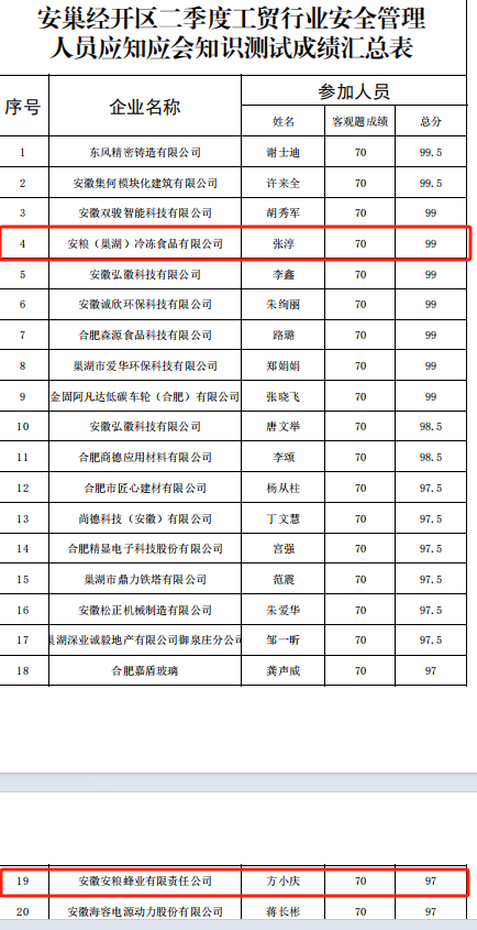 經(jīng)過(guò)激烈角逐,我司選手表現(xiàn)出色,安糧冷庫(kù)張淳同志憑借扎實(shí)的專(zhuān)業(yè)知識(shí)和出色的應(yīng)試能力榮獲第二名,安糧蜂業(yè)方小慶同志也緊隨其后,榮獲第五名。這兩位同志的優(yōu)異成績(jī)不僅彰顯了安糧巢湖食品工業(yè)園在安全管理工作方面的突出成效,也為我司贏得了榮譽(yù)。